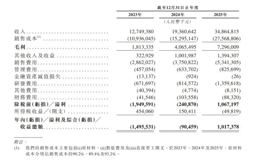 岚图汽在2023-2025年,销量分别是50285辆、80116辆、150169辆汽车,期间复合年增长率为72.8%。同期三年,营收分别是127.49亿元、193.6亿元及348.6亿元,2023–2025年复合年增长率为65.4%。岚图汽车2025年实现净利润10.2亿元,成功实现年度盈利;毛利率稳定在20.9%,位居行业前列,年度的合并损益表概要清晰呈现出持续改善、稳步盈利的良好态势,为资本市场表现奠定了坚实基础。